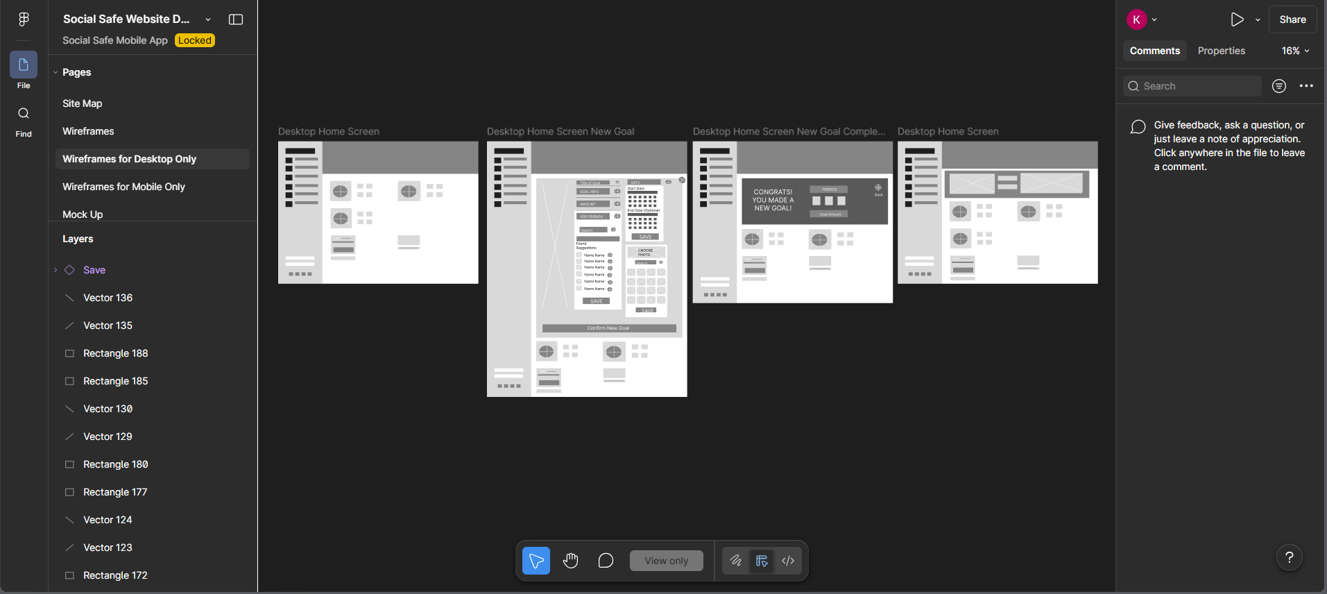 Wireframes for the desktop version of Social Safe.