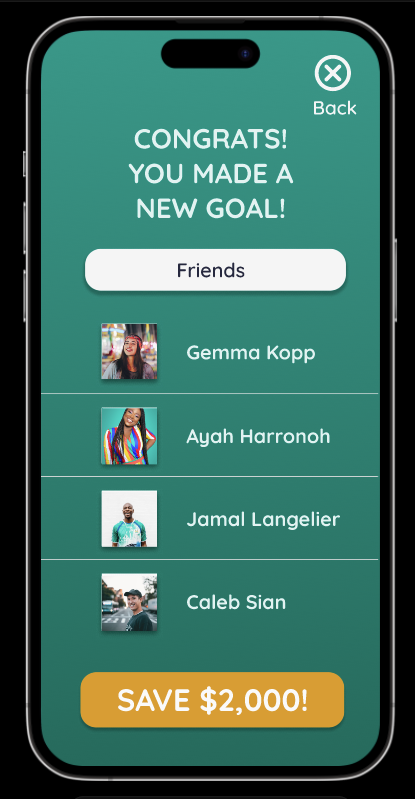 My design inspiration for this project was a combination of money saving apps and social media apps, with my logo invoking a clean and easy communication style, with the four simplistic people lined up in a way to suggest growth together. The color choices were very light greenish teal in order to suggest a calm app experience, while pops of yellow indicate big goal needs.